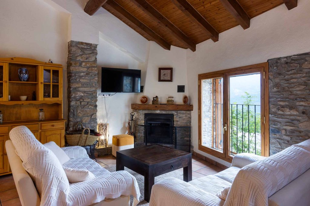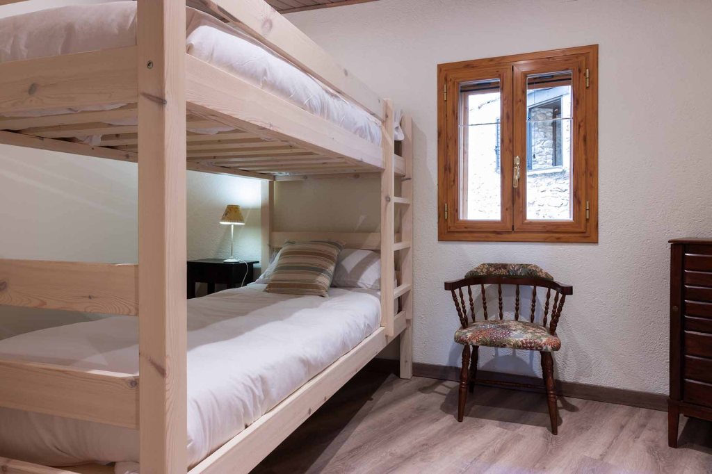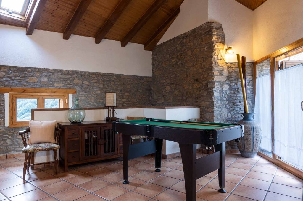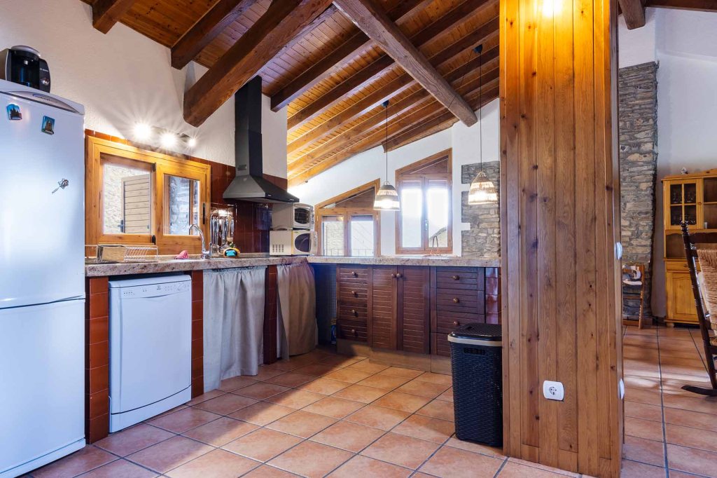 La casa disposa de tres habitacions dobles i dos banys complets a la planta inferior. La planta superior és un espai ample que disposa de cuina totalment equipada, menjador i racó de repòs amb TV, llar de foc i vistes a la muntanya.